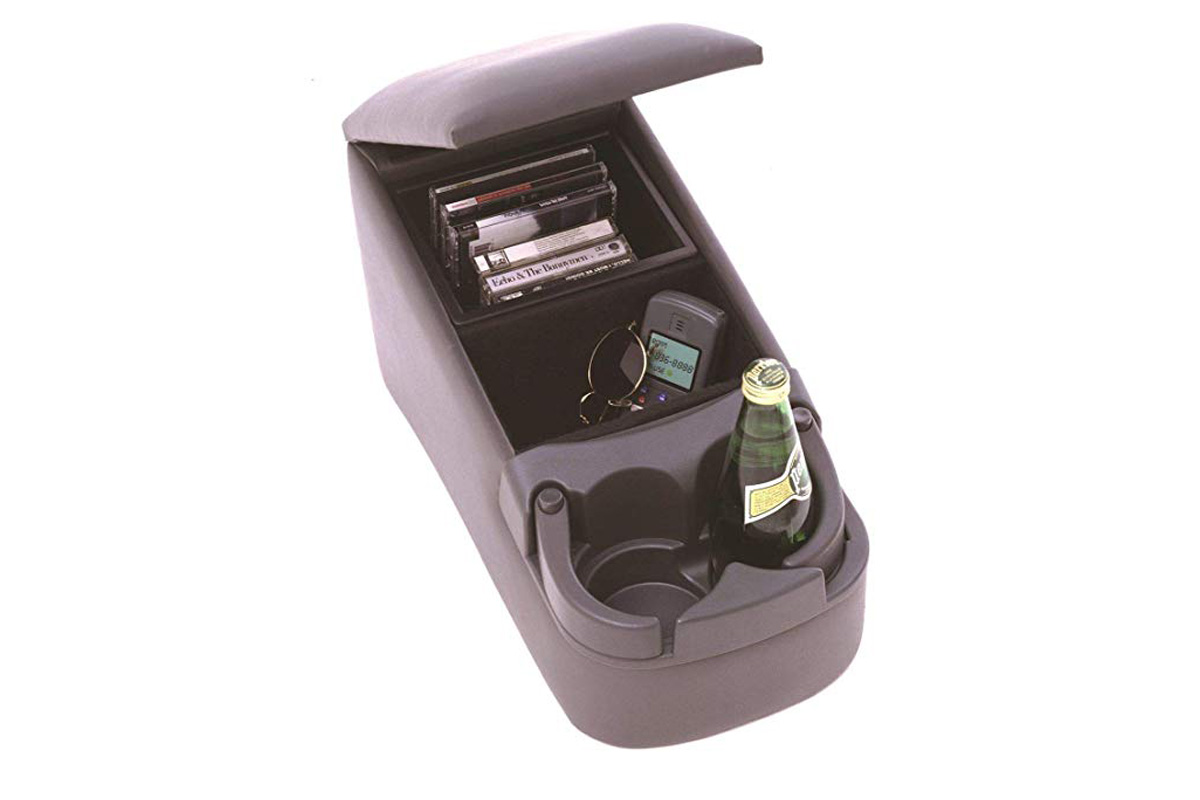 Organice su vehículo con esta unidad de consola central. El reposabrazos acolchado se levanta para acceder al espacio de almacenamiento. Dos portabebidas ajustables están incorporados. Se fija al cinturón de seguridad en el centro del asiento del banco delantero o trasero.
