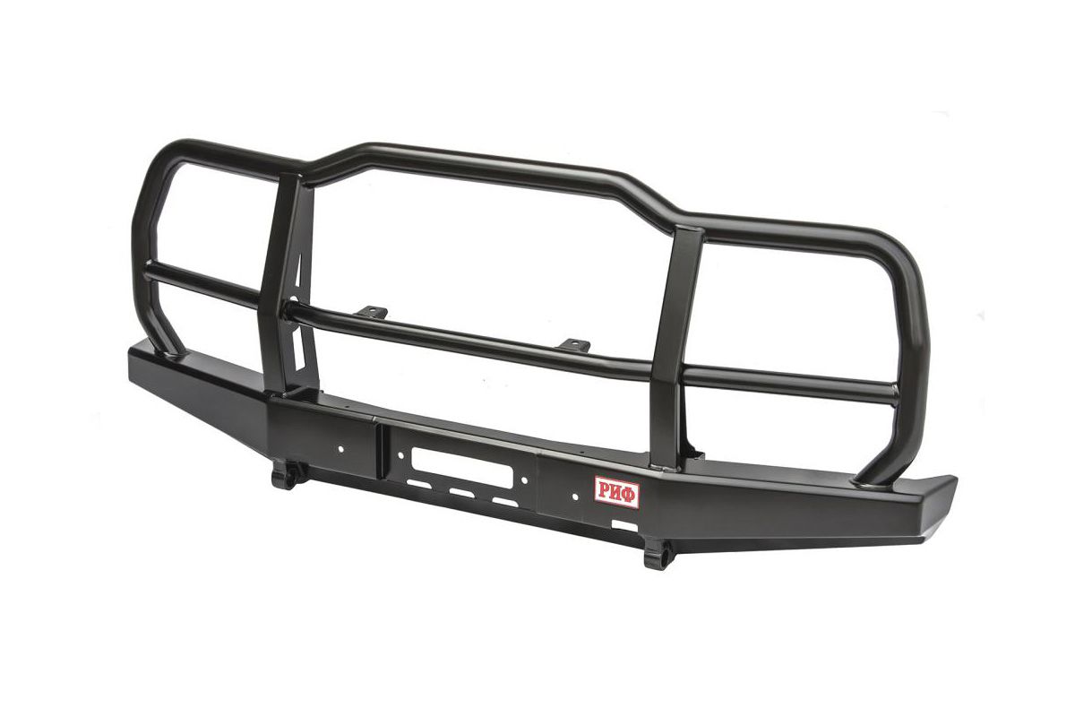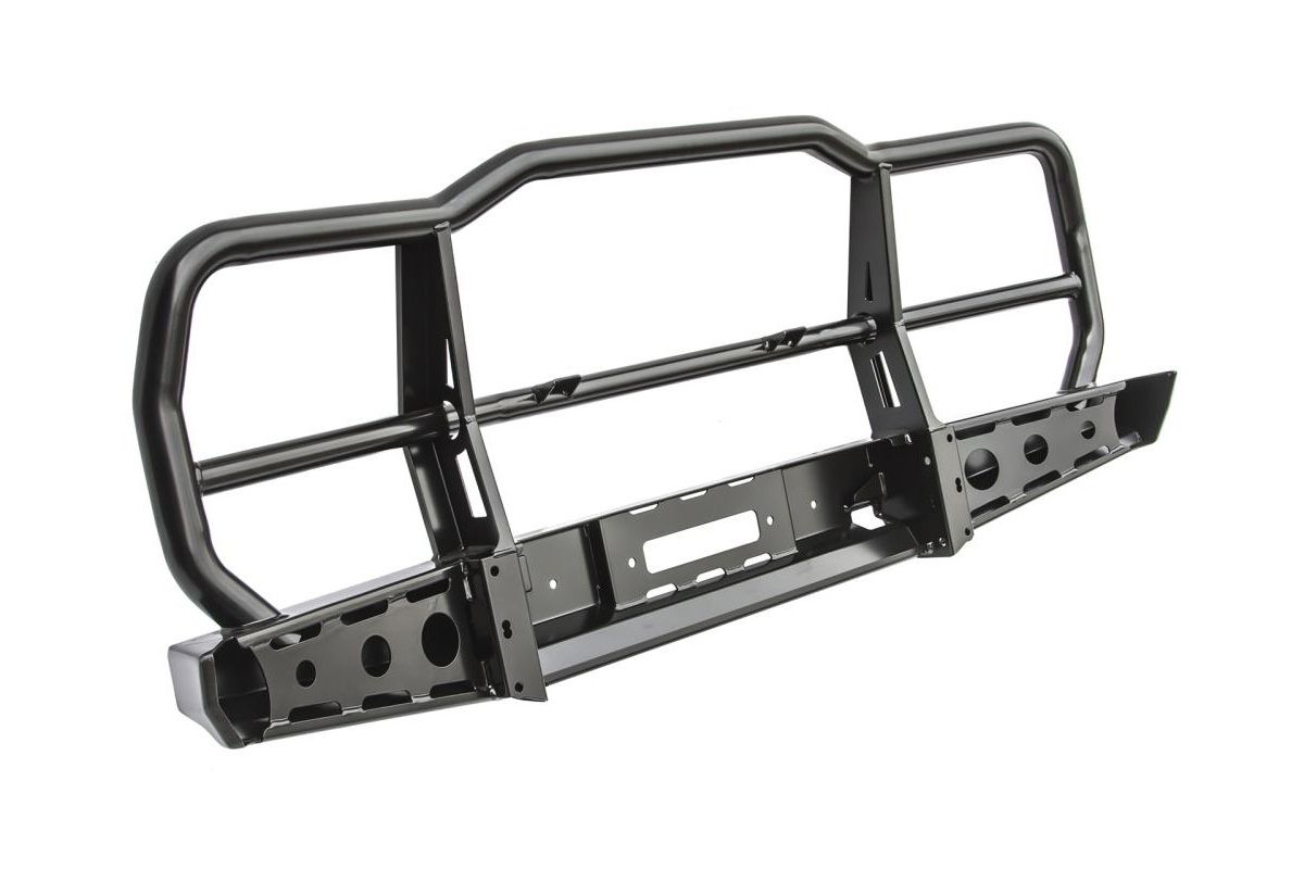 La versátil barra parachoques se adapta tanto a vehículos estándar como a vehículos elevados. Además, la barra de parachoques se puede cambiar de un vehículo elevado a uno no elevado y volver en cualquier momento. La defensa no tiene un marco de montaje integrado, por lo que debe adquirirse por separado. El bastidor de montaje se fija al bastidor del vehículo. La defensa RIF tiene una abertura para una cuerda de torno. La barra ofrece puntos de elevación de alta elevación reforzados y argollas de remolque para correas de enganche o de remolque. Resistente incluso a los productos químicos más agresivos, el revestimiento de polvo negro evita la corrosión en cualquier entorno.